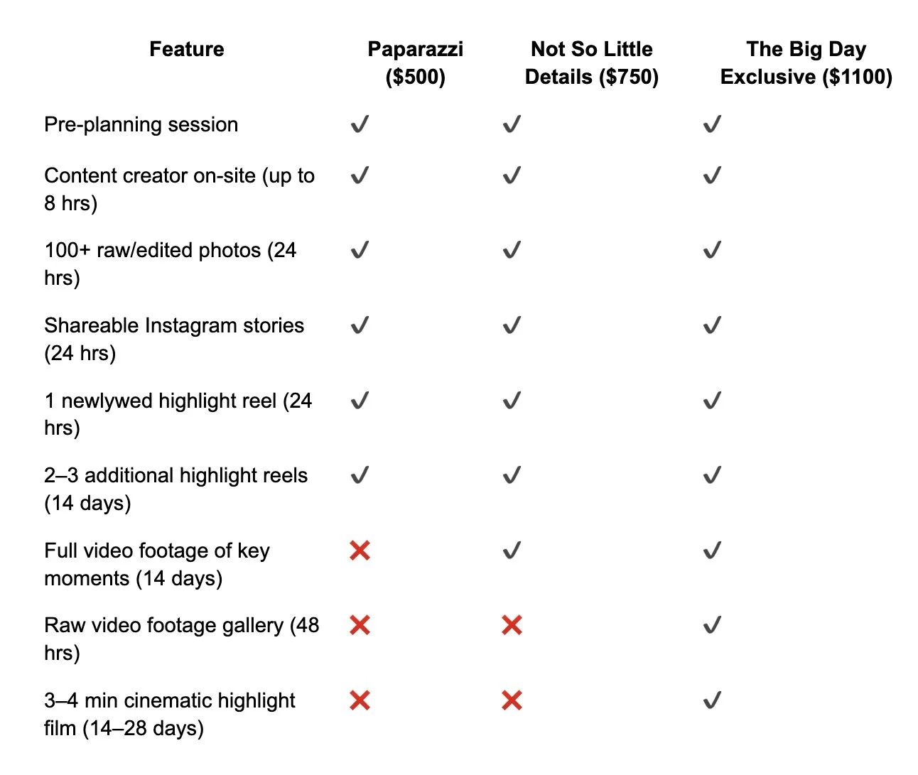 Looking for a custom package? Let’s create something that works for your vision and budget.